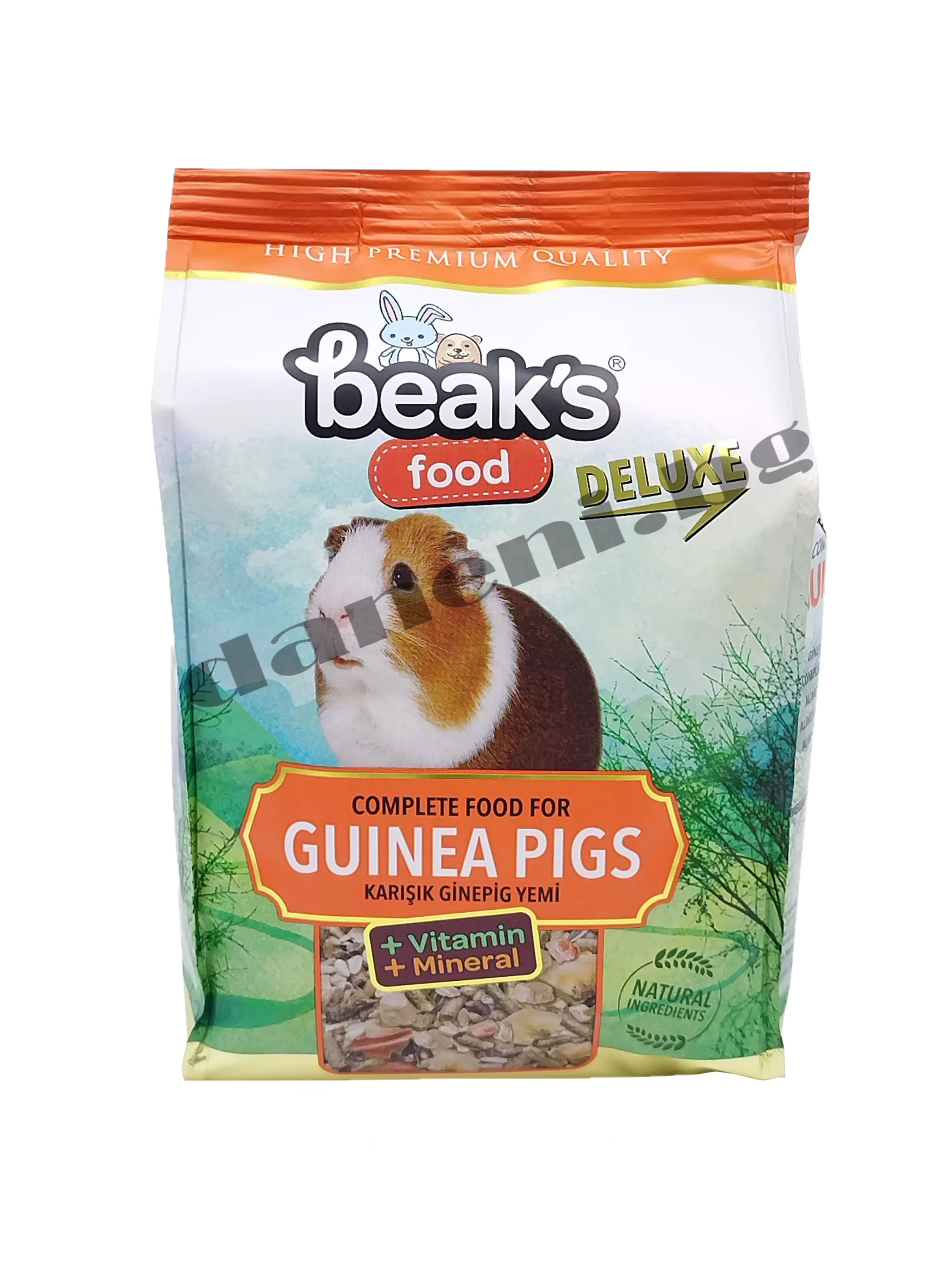 Висококачествена храна за морски свинчета Beaks Deluxe Natural Food Guinea Pigs е пълноценна храна, богата на витамини С, минерали, сушени зеленчуци, плодове, зърнени храни както и храна на гранули. Това е пълноценна храна, приготвена да отговори на всички нужди на вашите морски свинчета.