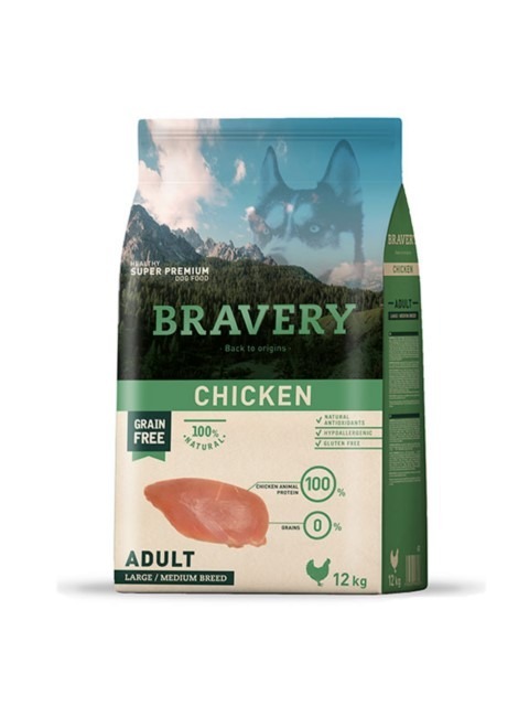 Bravery Dog Adult Medium & Large е храна за кучета без зърно, произведена специално за средни и едри породи, с вкус на пилешко месо.