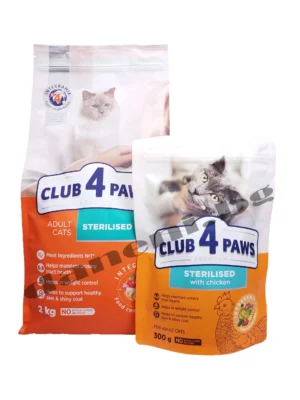 Club 4 Paws Premium Cat Adult Sterilised е премиум храна създадена, за да отговори на нуждите на котката след стерилизация (кастрация). Club 4 Paws, съдържа месни съставки №1 в състава, включително 24% пиле, което има висок коефициент на усвояемост. Балансиран протеинов и мастен състав, който помага на кастрирани котки да поддържат оптимално тегло. DL-метионинът е основна аминокиселина, която регулира метаболизма, гарантира здравето на бъбреците и насърчава възстановяването на чернодробните клетки. Специалният баланс на Ca, P и Mg предотвратява уролитиазата чрез намаляване на кристалите в урината.
