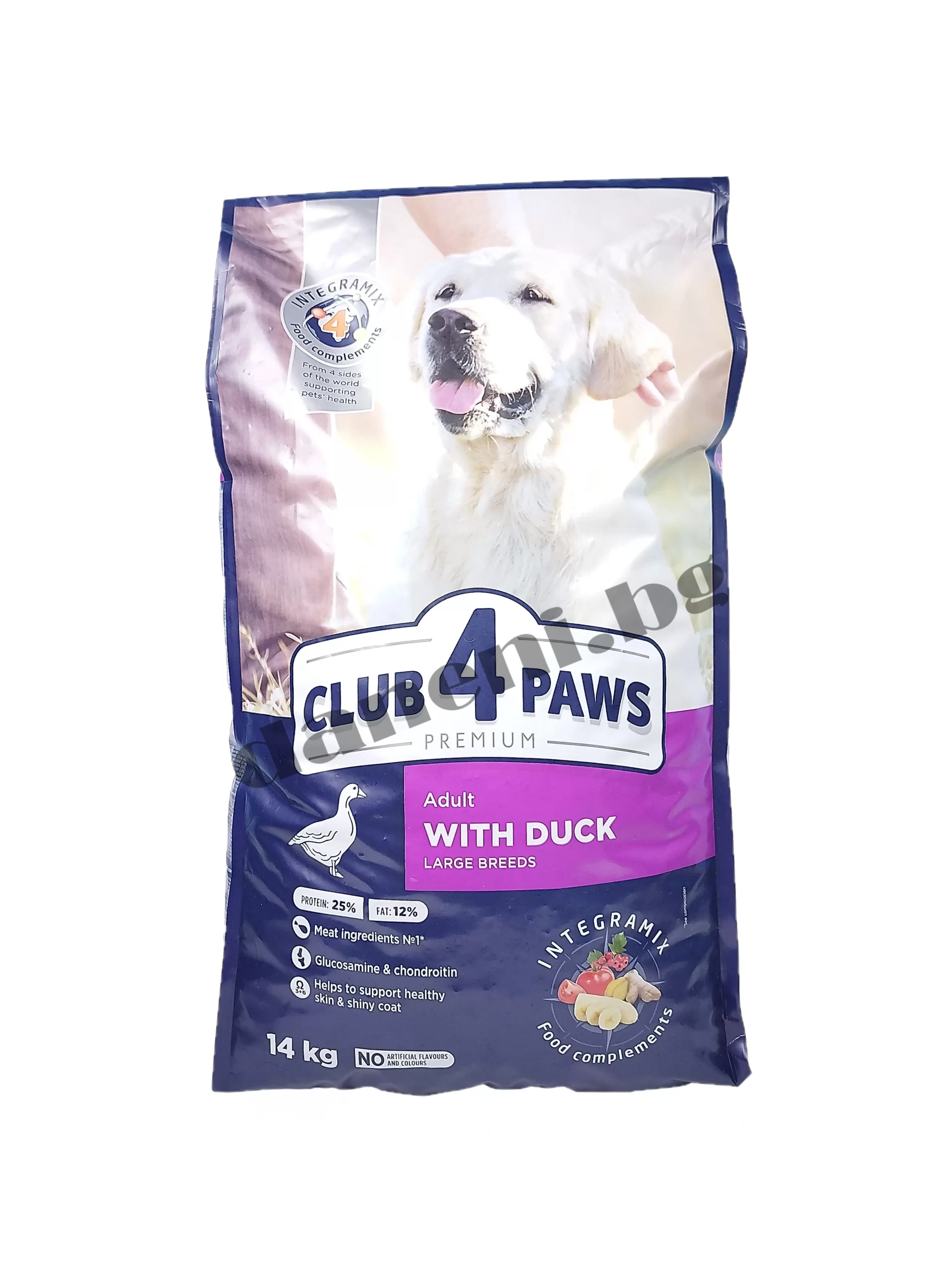 Суха храна за кучета Club 4 Paws Premium Adult Dog Large Breeds, Патица е пълноценната суха храна за кучета, която е обогатена с хондроитин и глюкозамин за здрави стави и кости на кучета от големи породи.