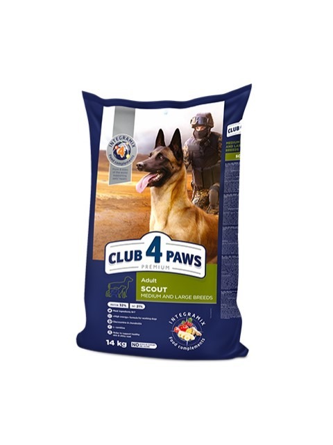 Суха храна Club 4 Paws Premium Dog Adult Scout Medium and Large Breed е висококалорична балансирана първокласна храна за работни кучета от средни и големи породи с високо съдържание на протеини (32%) и мазнини (21%). В сътрудничество с водачите на кучета, CLUB 4 PAWS създаде уникална формула HIGH ENERGY 32/21, която осигурява високи калорични нужди, издръжливост, внимание и висок капацитет за работа на кучета-скаут.