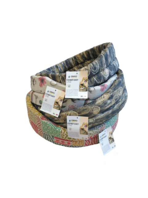 Леглото Croci има удобна овална форма и високи странични бордове. Предният борд е по-нисък, за по-лесен достъп на животното. Леглото е покрито с тапицерия от памук с различни разцветки.