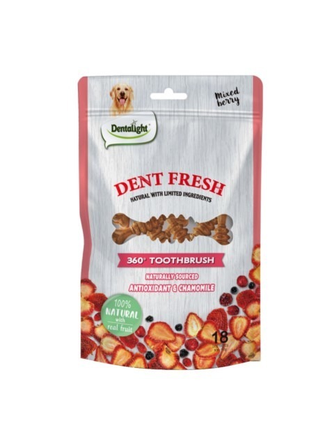 - Дентална четка за кучета DENT FRESH 360° CALMING SUPPORT MIXED BERRY съдържа антиоксиданти и лайка за успокояващ ефект.