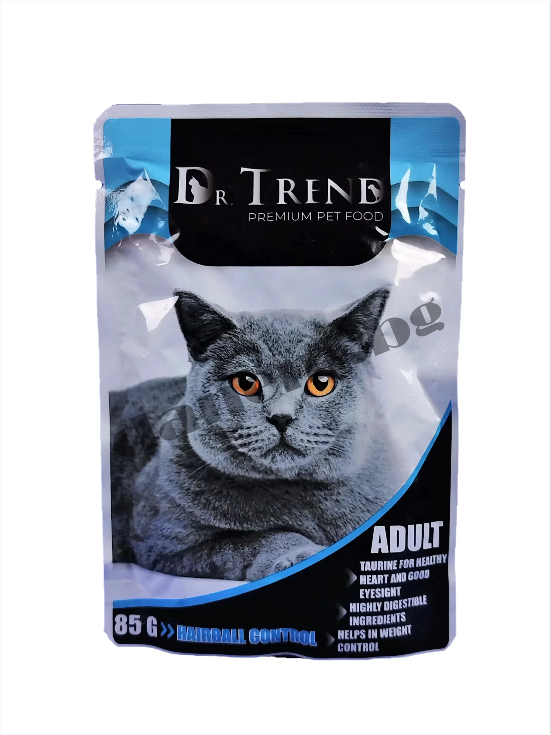 Dr. Trend Premium Hairball Control Adult Cat е достъпен и питателен пауч за котки. Серията включва различни видове за всяка възраст и нужда – junior, adult, sterilised.