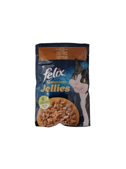 Пауч за котки  Felix Sensations е направен от нежни месни пилишки парченца и моркови сервирани с вкусни и ароматни желета за невероятен вкус и аромат.