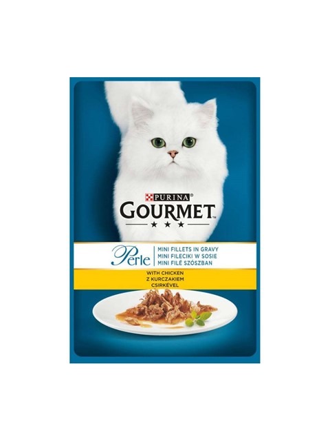 Храна в пауч за котки Gourmet Perle Pouch, Пилешко филе в сос. Фини филенца от месо или риба, внимателно приготвени в оригинални и иновативни рецепти. Изкушение, пред което Вашата котка с удоволствие ще се предаде.