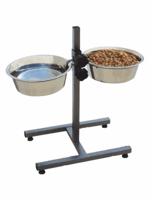 Широката тежка Н образна поставка е стабилна, купите се захващат и пристягат към поставката с фиксатори, които не позволяват кучето да обърне купите. Височината се регулира според нуждите на кучето.