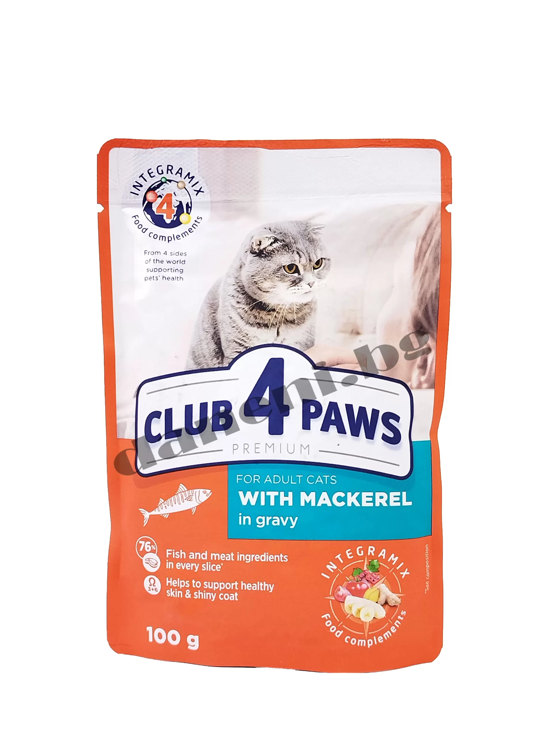 Club 4 Paws Premium Adult Cat, Скумрия в сос e пълноценна храна за котки под формата на пауч. Съставът включва рибни и месни съставки, обогатена е с всички основни витамини и минерали, Омега 3 и Омега 6 които са необходими за здрава кожа, красива и блестяща козина. Специалната формула INTEGRAMIX състояща се от 4 съставки от 4 кардинални посоки за цялостна подкрепа на здравето и имунитета на домашния любимец.