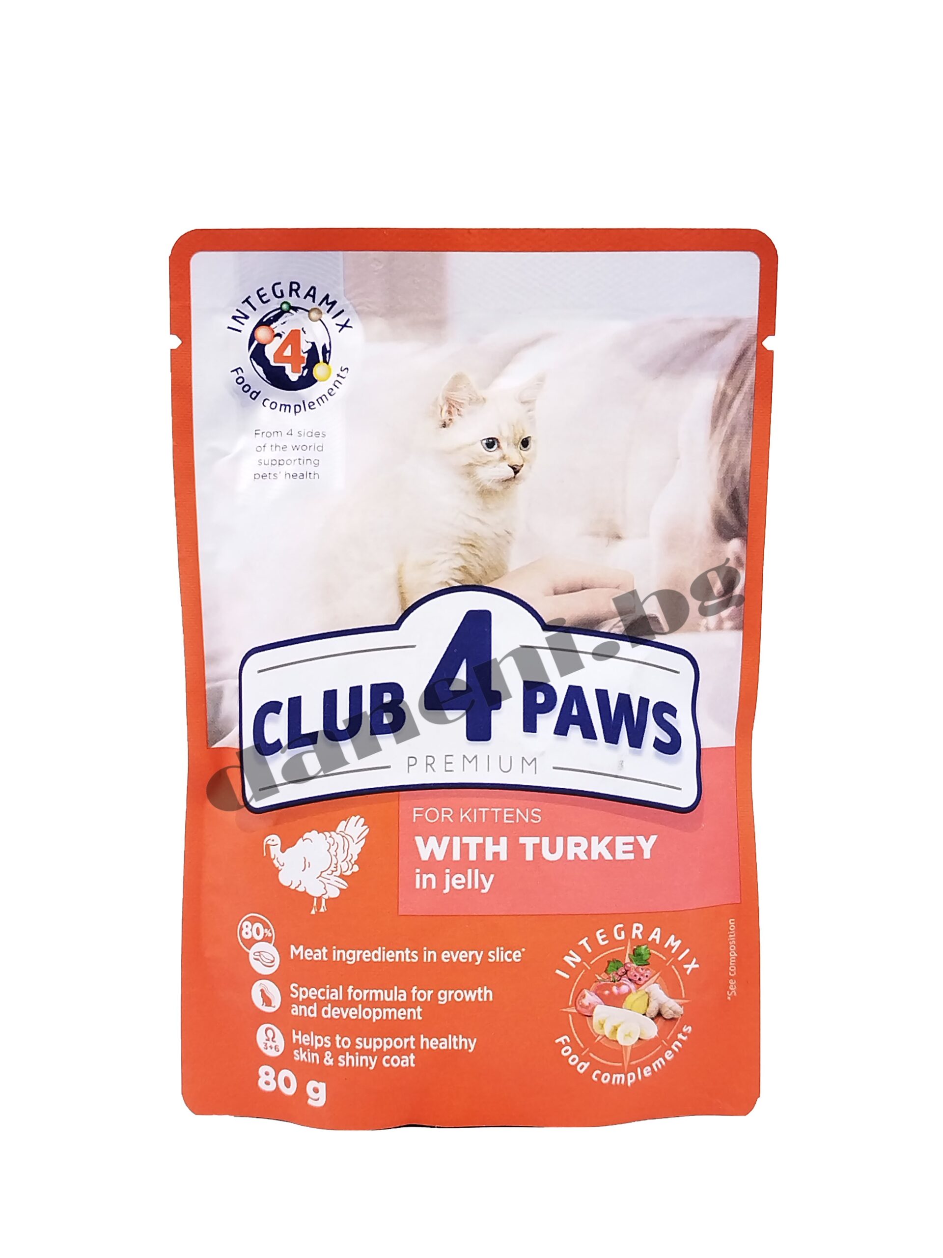 Храна – пауч Club 4 Paws Premium Kittens с пуйка в желе за малки котета, съдържа само висококачествено месо и вътрешности от животински произход. Комплексът от ненаситени мастни киселини Омега 3 и Омега 6 поддържа кожата здрава, а козината блестяща. Храната е обогатена с INTEGRAMIX за общо здраве и подкрепа на имунитета.