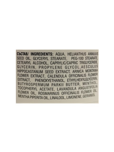 Състав: aqua, слънчогледово олио, екстракт от конски кестен, арника, невен, масло от ший, лавандулово олио, розмарин, мента, лимон, глицерил стеарат, peg-100 стеарит, цетостеарилов алкохол, каприлик триглицерид, глицерин, пропиленгликол, феноксиетанол, етилхексилглицерин, гераниол, линалол.