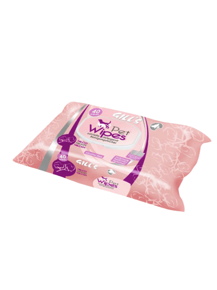 Мокри кърпи Gill’s за почистване и инеутрализиране на лошите миризми. Деликатен и свуж аромат на талк, който не пречи на обонянието на животното. За кучета, котки, кученца и котенца.