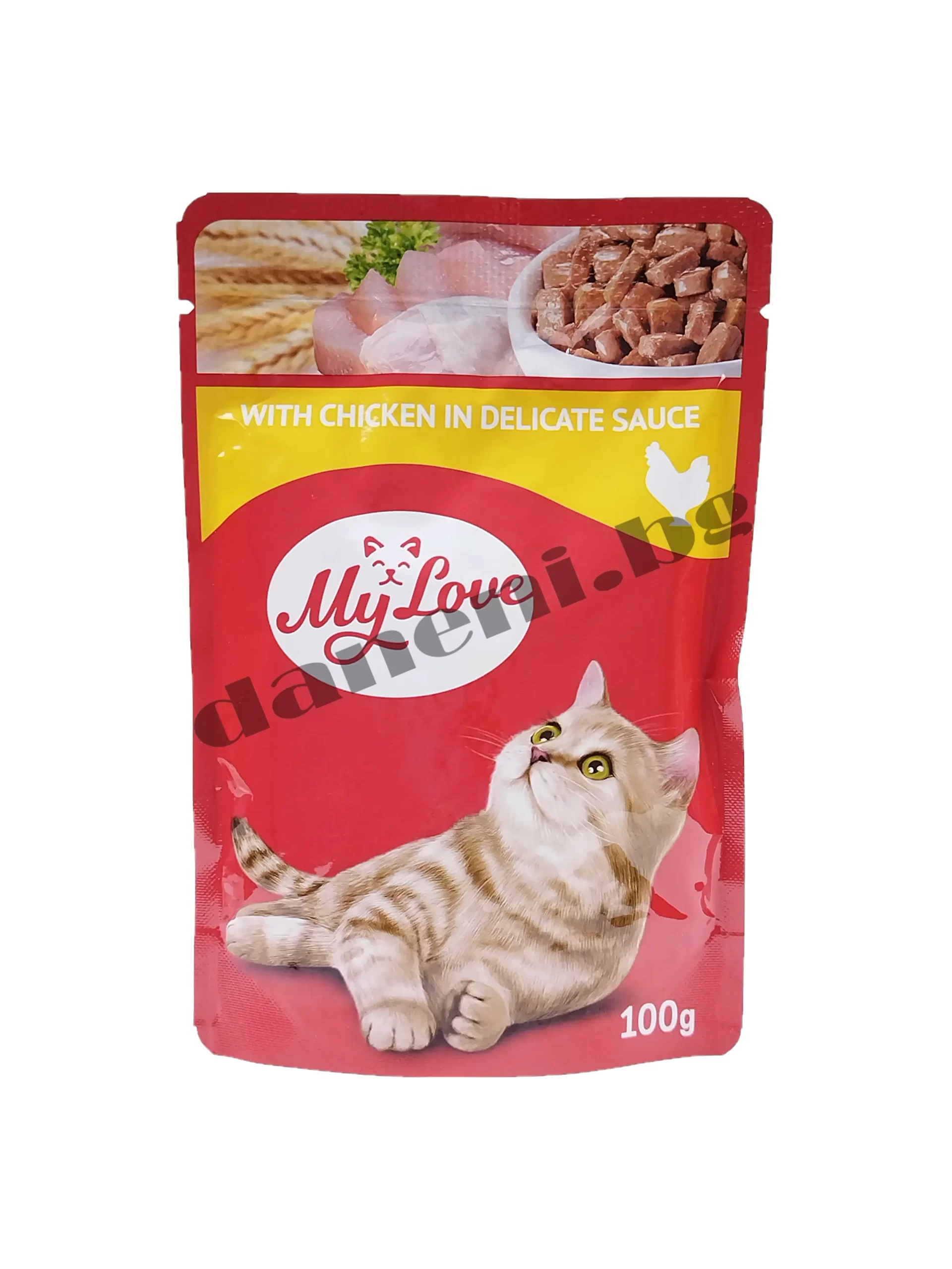 Храна под форма на пауч за котки My Love (Мяу). Съдържа месо и продукти от животински произход най-малко 76%, включително пилешко месо най-малко 4%; зърнени култури, екстракти от растителни протеини, минерални вещества, производни продукти от растителен произход магданоз 0,001%. Може да се комбинира с друга храна. Осигурява на котките необходимото количество от хранителни вещества, витамини и микроелементи.