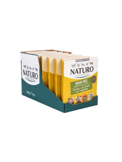 Naturo Dog Natural Grain Free, мокра храна за кучета, без зърно специално създадена за кучета, които страдат от чувствителни коремчета. Съставки внимателно подбрани, за да помогнат за насърчаване на здрава храносмилателна система и щастливо, здраво куче.