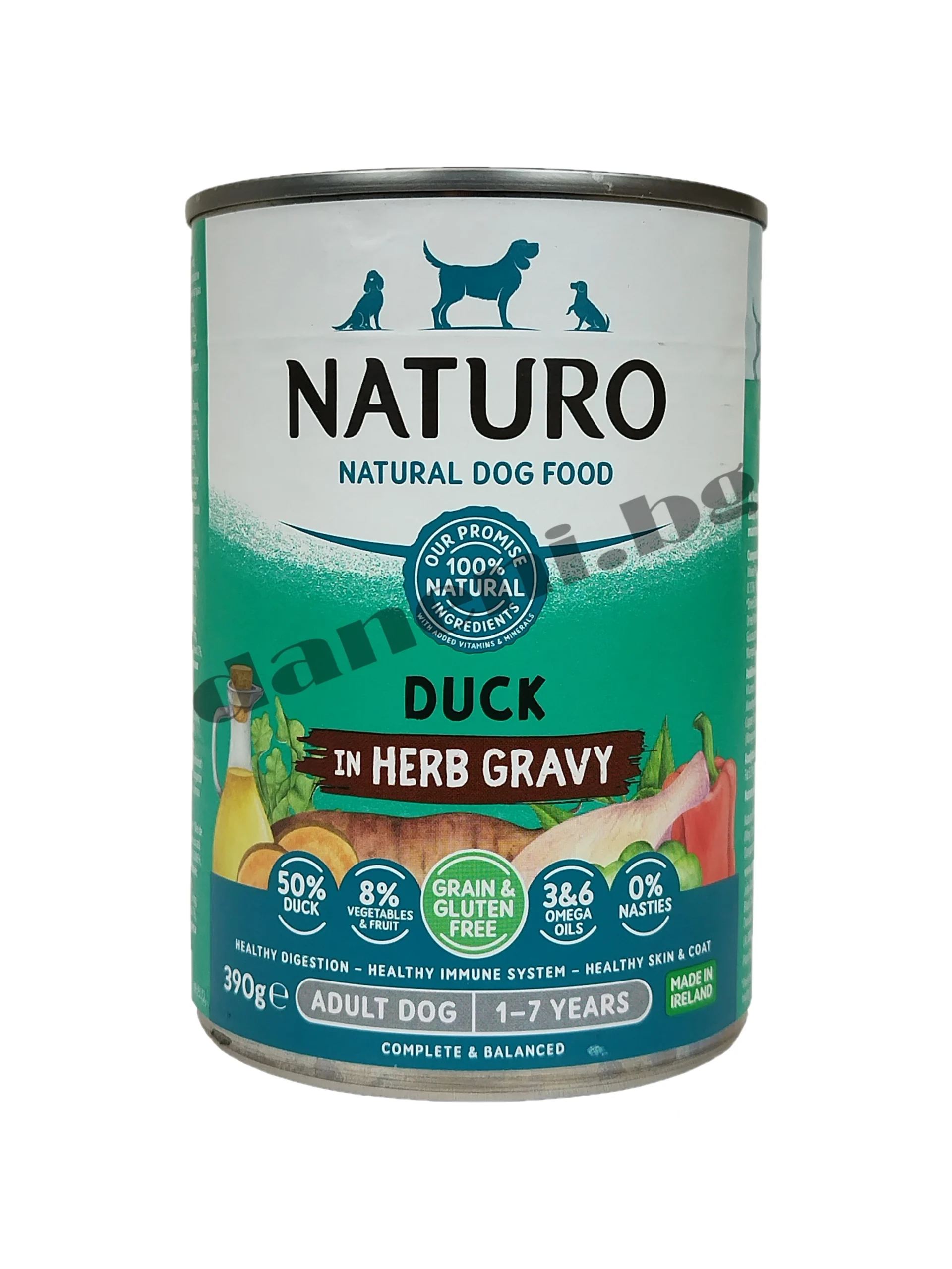 Консерва за кучета Naturo Dog Natural Duck in Herb Gravy, патица в зеленчуков сос е мокра храна за кучета без зърно и без глутен и е специално създадена за кучета, които имат чувствителни коремчета или непоносимост.