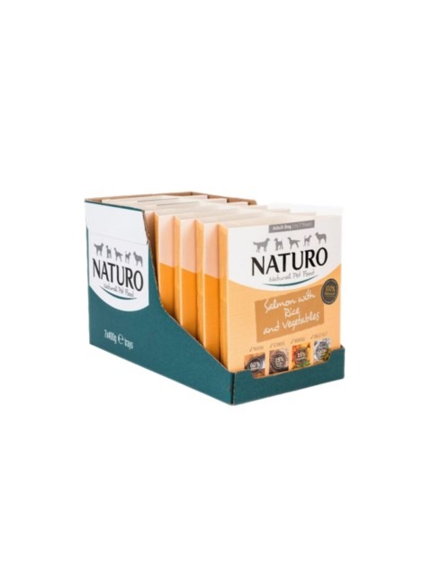Naturo Dog Natural Salmon with Rice and Vegetables. Вкусна мека храна за кучета, съдържа 60% сьомга, лесен за смилане, постен и богат на витамини източник на протеини. Сьомгата съдържа омега 3 и омега 6 мастни киселини, които помагат за здрава кожа и козина на вашето куче. Храната съдържа също 15% зеленчуци и 15% кафяв ориз, което позволява пълно с енергия, лесно смилаема храна.