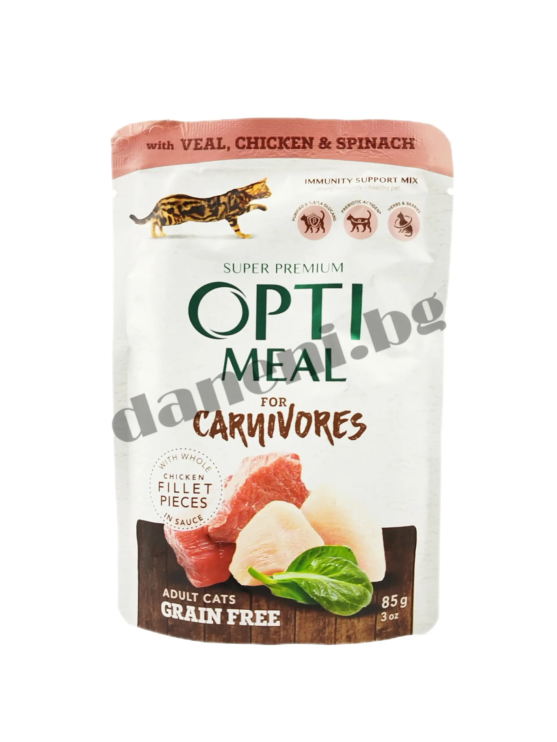Opti Meal for Carnivores Grain Free – Пауч за котки с телешко и пилешко филе със спанак 85 гр