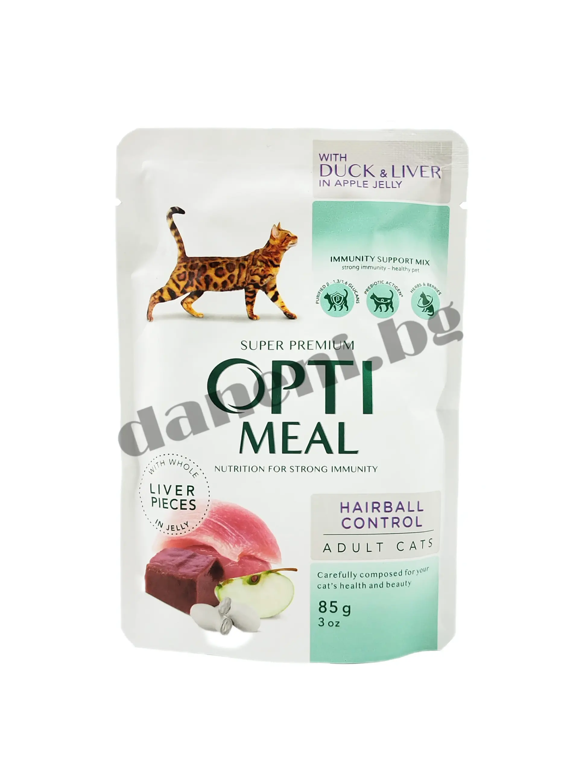 Пауч за израснали котки Opti Meal Grain Free Hairball Control – Патешко с дроб и ябълки в желе 85 гр