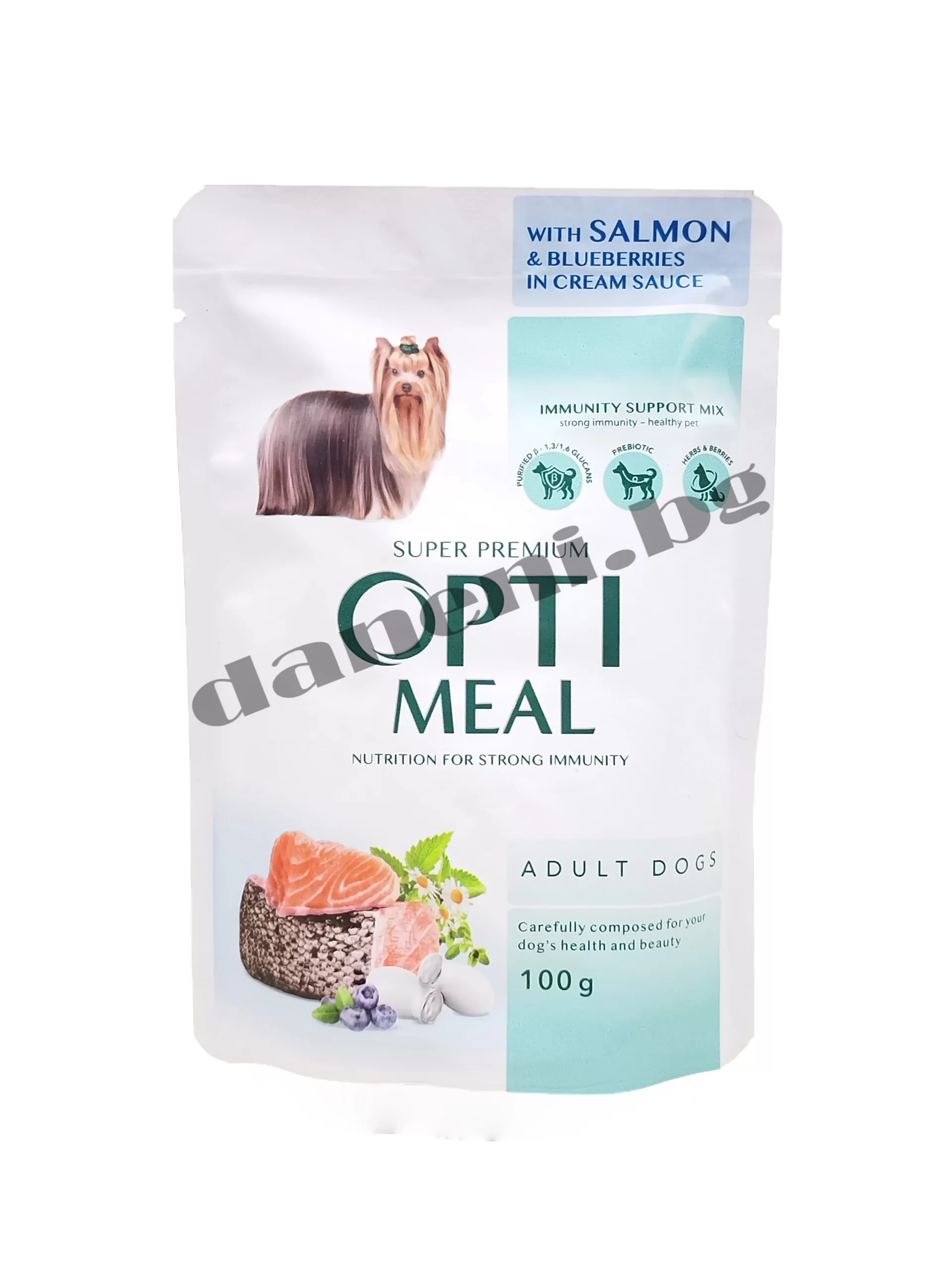 Opti Meal Super Premium Adult Dog Pouch – Пауч за израстнало куче – Сьомга и боровинки в сметанов сос 100 гр