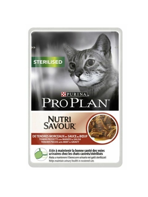 Purina Pro Plan Sterilised Cat Nutrisavour Pouch, говеждо в сос е мокра храна за възрастни кастрирани или стерилизирани котки. Помага за поддържане на здравословно телесно тегло.