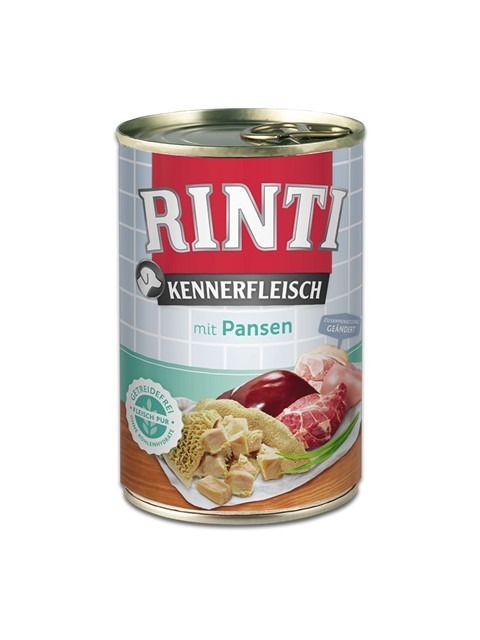 Консерва за кучета Rinti Kennerfleisch Adult Dog, Говеждо шкембе. Високо съдържание на месо: 70% месо и вътрешности, Rinti е богат на естествени парчета месо.