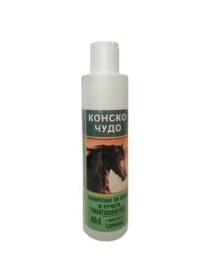 Шампоан за коне и кучета Конско Чудо с АДзЕ, масло от здравец e козметичен продукт за здрав косъм, с естествен блясък и копринена мекота.