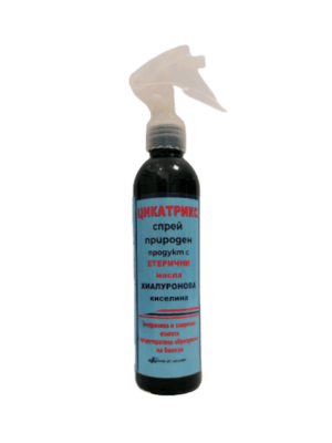Спрея за рани при кучета и коне Цикатрикс е с етерични масла и хиалуронова киселина.