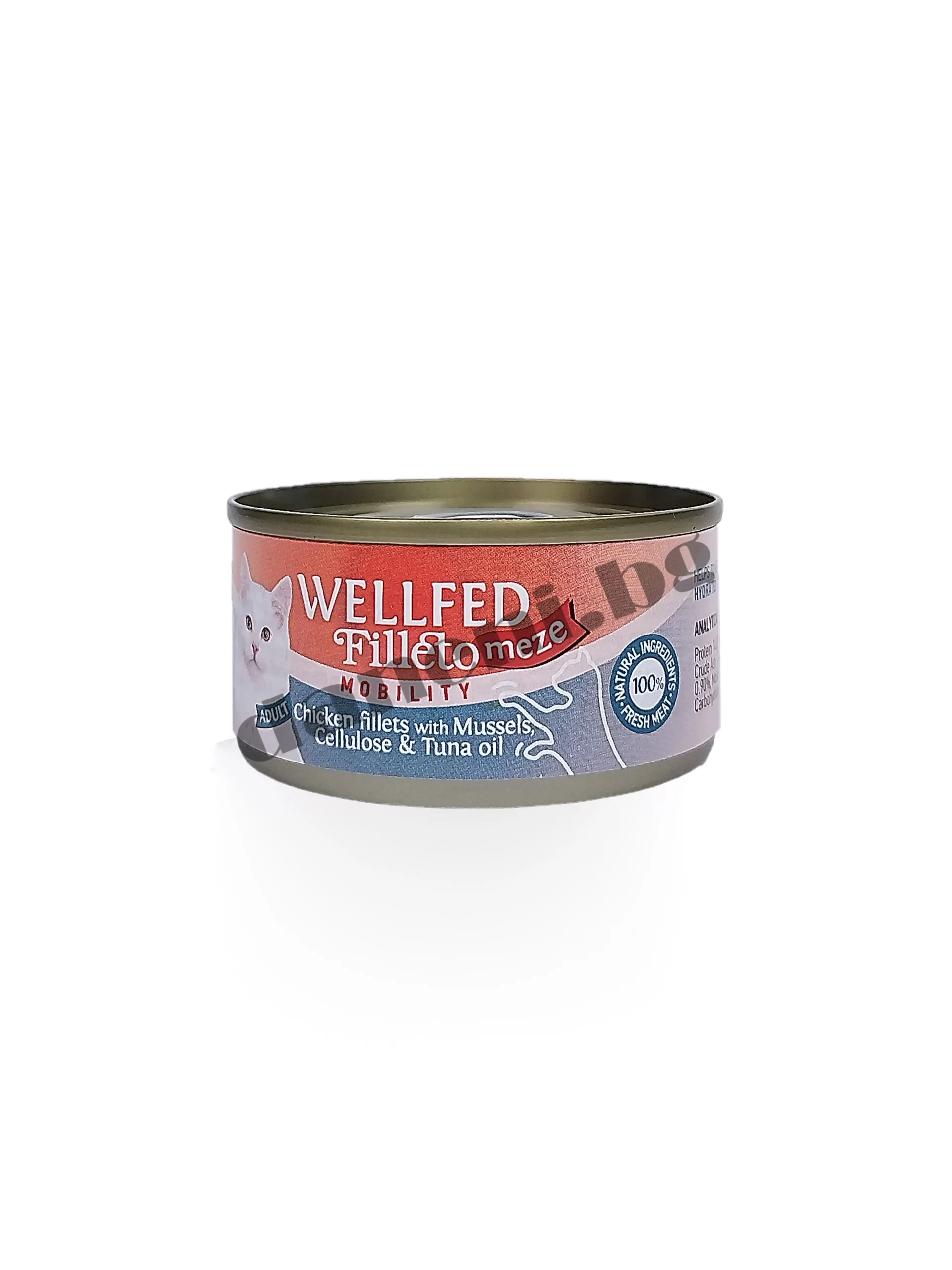 Консерва за котка Wellfed Filleto meze Mobility Ultra Premium, Пилешки филенца с миди, целулоза и масло от риба тон, 70 гр